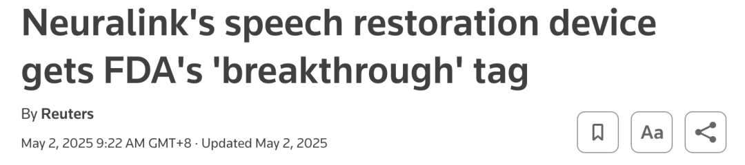 今年5月,Neuralink还获得了美国FDA授予的「突破性设备」资格,适用于言语与语言恢复方向。