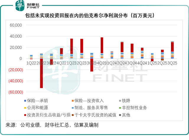 就其并表的业务而言,伯克希尔的经营业绩不错,见下图,第3季的保险承销业务净利润同比增长215.87%,至23.69亿美元,因上期保险业务重大赔付较高导致可比基数较低;主要为已确认出售投资损益和股息及利息在内的保险投资收入则按年下降13.18%,至31.81亿美元;铁路业务的季度利润按年增长4.77%,至14.49亿美元;能源等公共业务的季度利润则按年下降8.59%,至14.89亿美元;制造、服务和零售业务利润按年增长8.20%,至36.16亿美元。