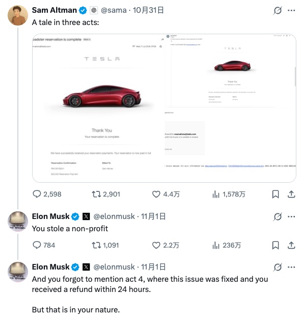 就在阿尔特曼发帖后不久,马斯克回帖称,该问题其实已经得到了解决,阿尔特曼明明在 24 小时内就收到了退款却故意不提。“不过这就是你的本性“,马斯克回怼道。