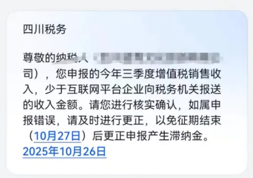 近日,有不少商家都收到了税务局提示合规纳税的短信,基本内容是提醒商家第三季度自行申报的增值税收入小于互联网平台保送的数据,责令其限期改正,否则有可能产生滞纳金。