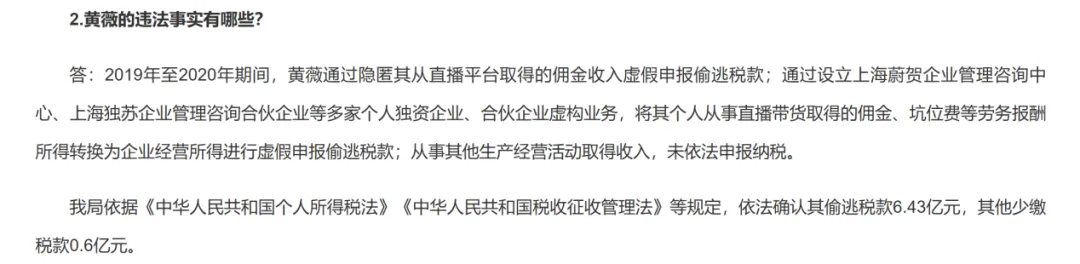 2021年底,杭州税务局对网络主播薇娅(黄薇)作出税务行政处罚,认定其在2019-2020年期间通过转换收入性质、隐匿收入等方式偷逃税款约6.43亿元,合计追缴税款并加收滞纳金、罚款共计13.41亿元。