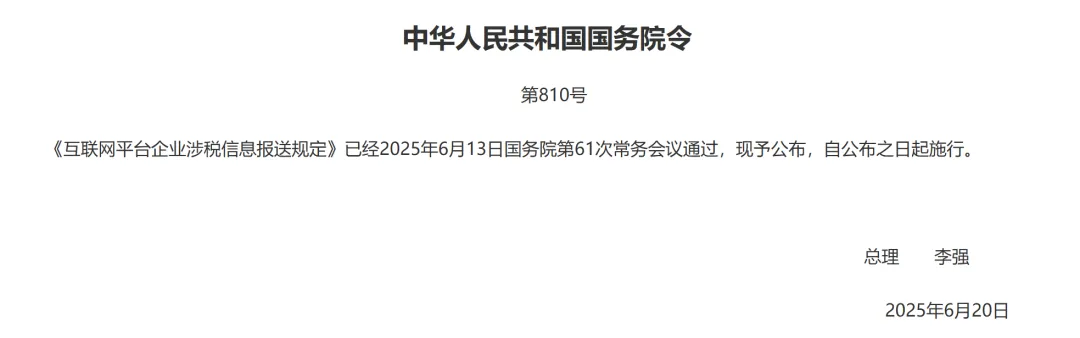 2025年6月,国务院发布《互联网平台企业涉税信息报送规定》(国务院令第810号),这一规定被业内称为“史上最严电商涉税新规”。