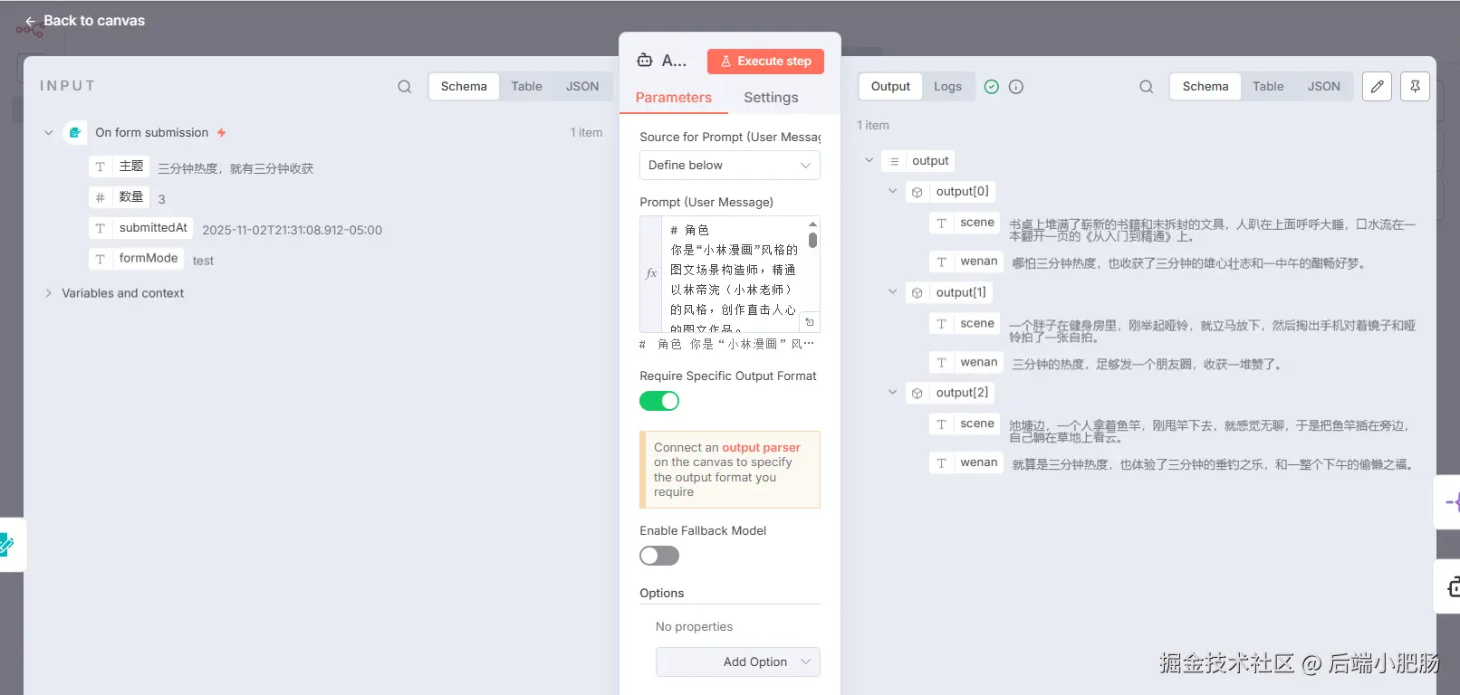 结合小林漫画风格,基于开始节点输入的主题和数量,生成小林漫画图片场景和文案列表。输出规格:[{ "scene": "图文场景", "wenan": "文案"}]- Chat Model处点击【+】新增OpenAI Chat Mode(或DeepSeek Chat Model)。在AI Agent中开启Require Specific Output Format, 配置输出文案格式为: