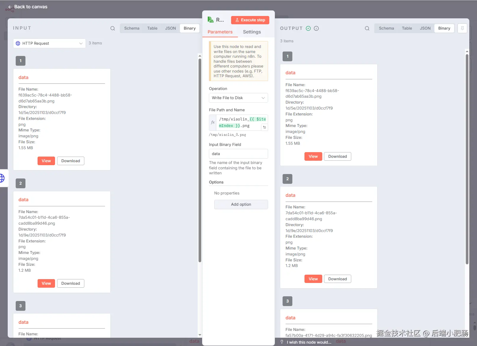 - Operation选择Write File to DiskFile Path and Name填写/tmp/xiaolin_{{ $itemIndex }}.pngInput Binary Field填写data