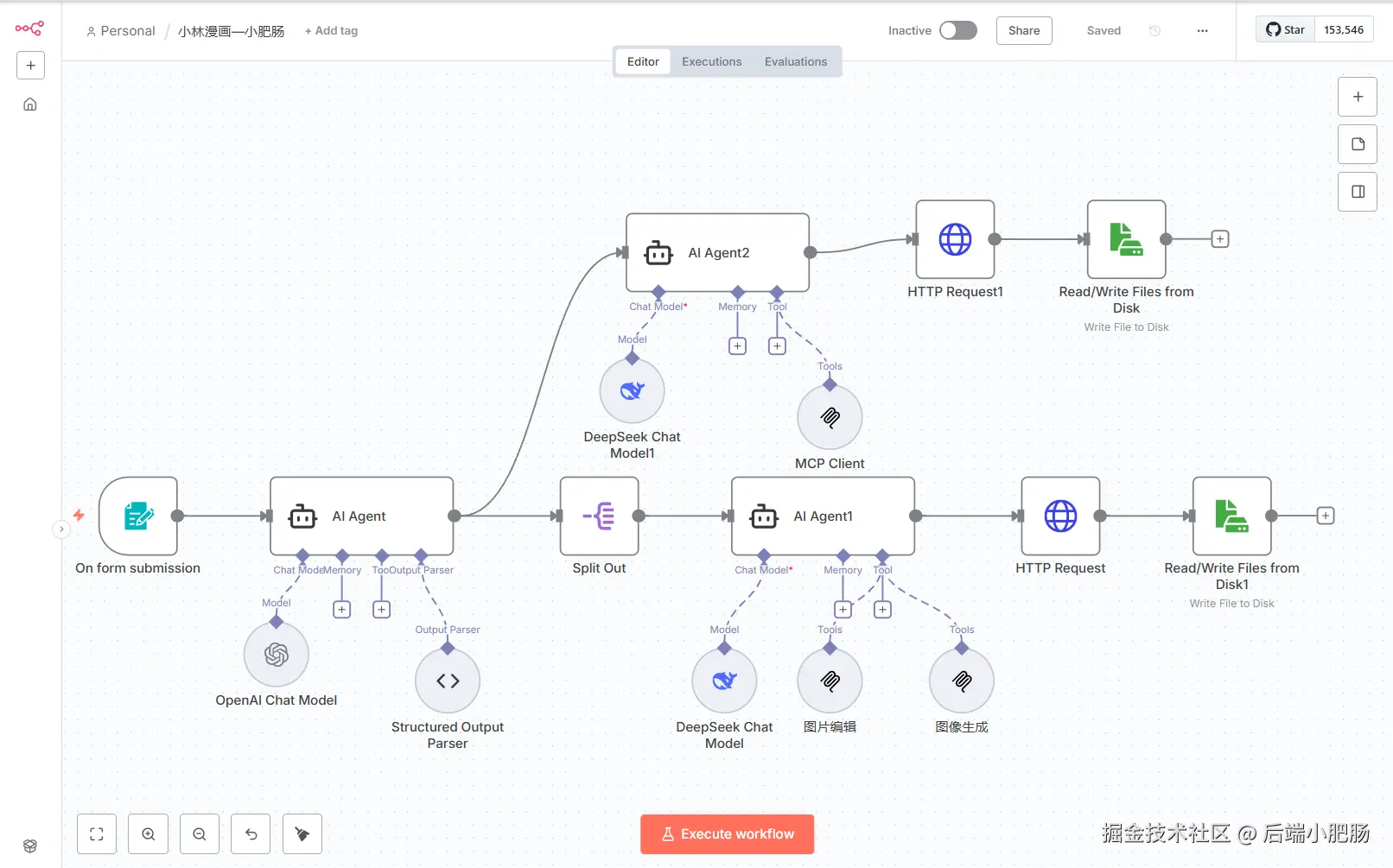 工作流的使用很简单,只需要点击底部的【Excute workflow】按钮。