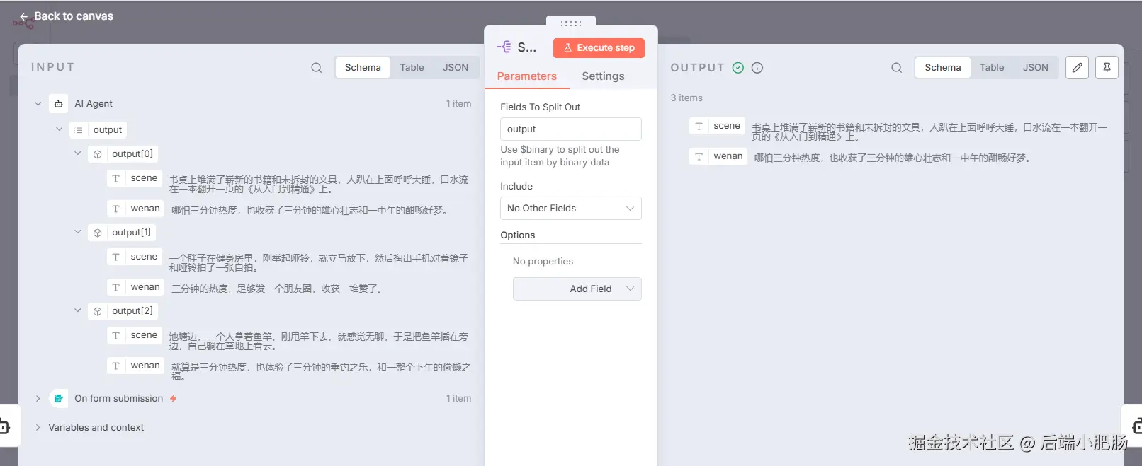 Split Out: AI Agent(生成场景和文案)节点出来后点击【+】选择Split Out。 这个节点的作用是将前面生成的的场景和文案数组分割为单个元素。