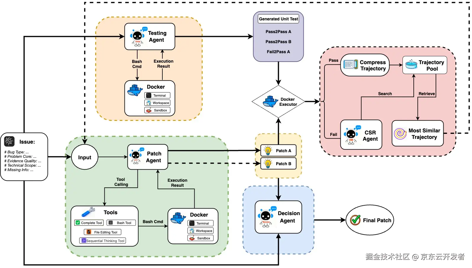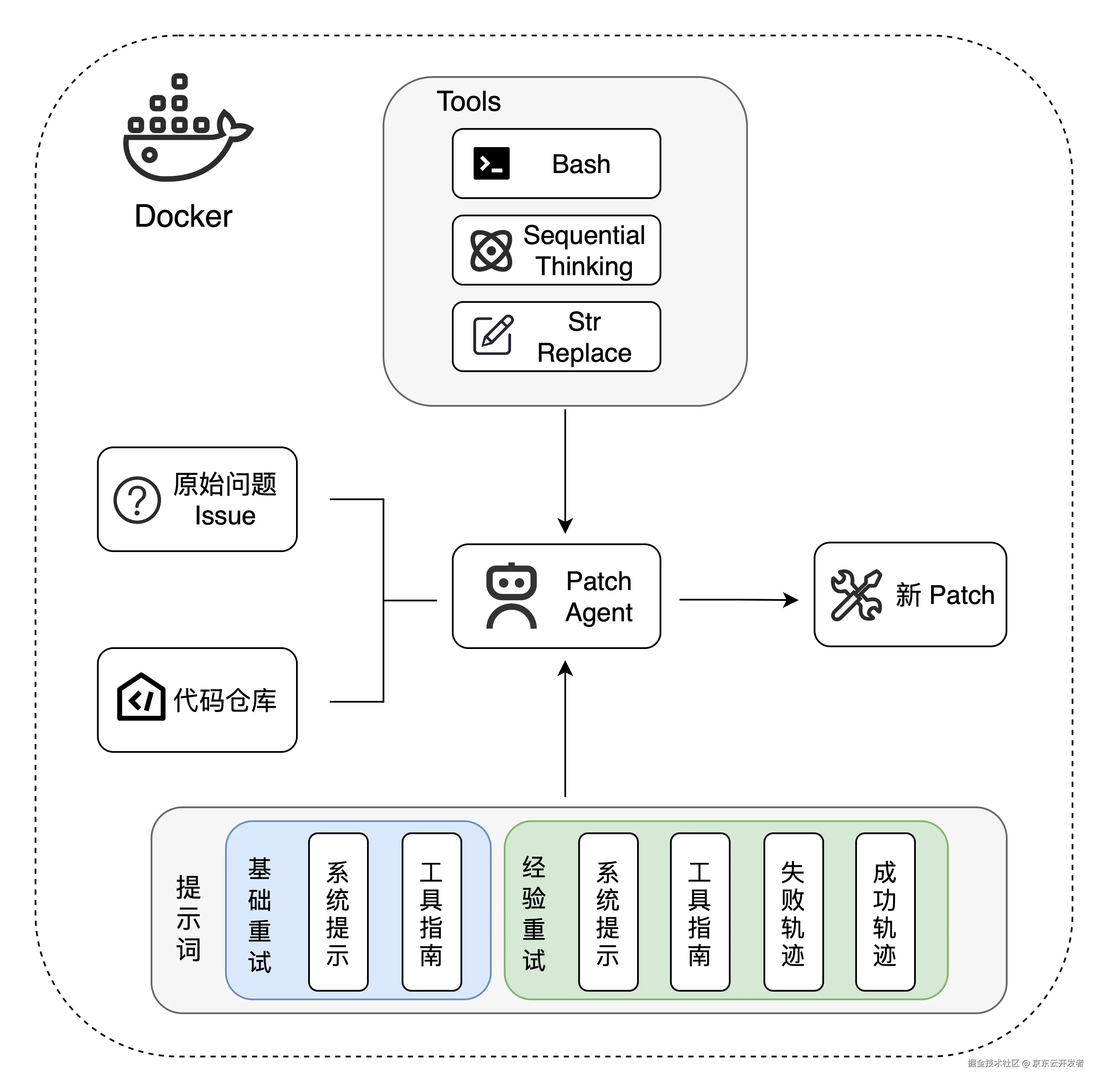 ▪将获取到的经验信息与上次失败(未能通过生成的测试套件)的 Patch 的压缩轨迹传递给 Patch Agent 进行经验重试。