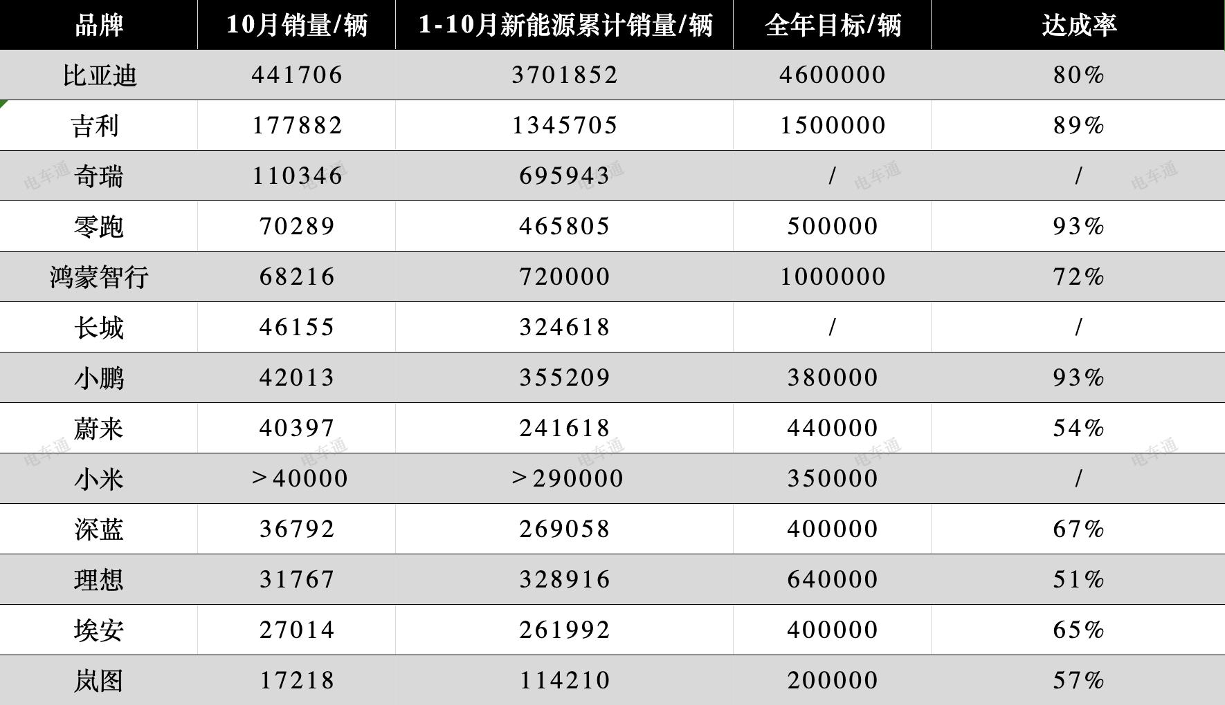 结合各家车企公开目标及前10个月销量表现,电车通对头部品牌全年业绩进行拆解分析。