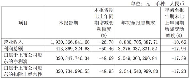 根据最新披露的三季报,今年前三季度今世缘分别实现营收和净利润88.82亿元和25.49亿元,营收和净利润增速分别为-10.66%和-17.39%,其中三季度实现营收和净利润19.31亿元和3.203亿元,营收和净利润增速分别为-26.68%和-48.69%。