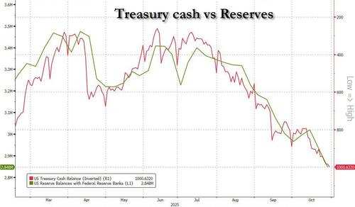 政府持续关门正成为货币市场流动性枯竭的主要推手,美国财政部一般账户(TGA)余额急剧膨胀。