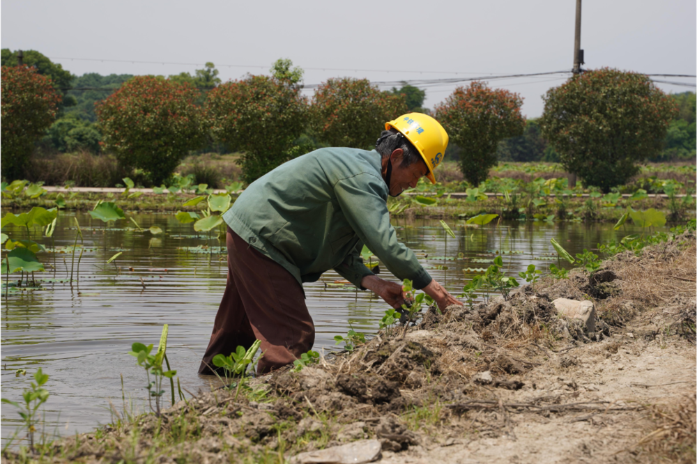 其中,湖南株洲的一位大叔给我的印象最深。那是2023年的夏天,太阳火辣辣地晒得人皮肤痛,我当时走在田埂上,迎面看见一位大叔把工地的安全帽当遮阳帽戴在了头上,然后走进藕田劳作。