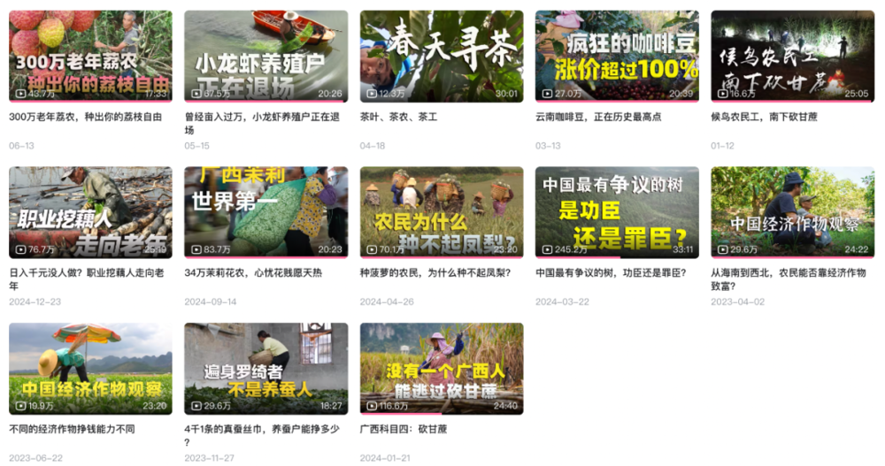 从2023年4月开始,我和贞贞决定开启一个系列纪录片:中国经济作物观察。目前已经更新到了第14集。我们想以经济作物为切入点,去理解土地、农民和农作物。