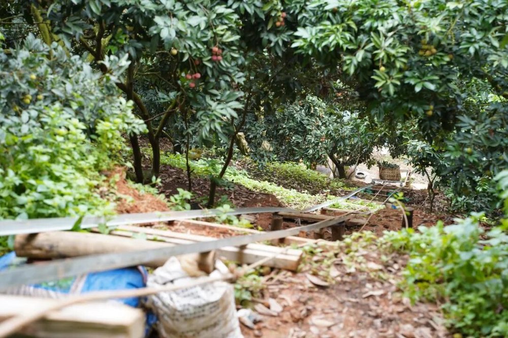 因为山坡上的荔枝树是这样的,坡度应该有四五十度。荔农是用简易的滑轨把摘下来的荔枝运下去的。