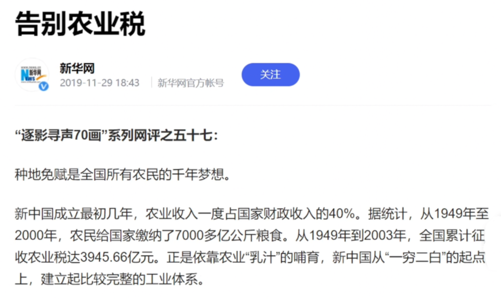 2019年新中国成立70周年时,新华网发表了一篇叫做《告别农业税》的新闻评论,里面写道: