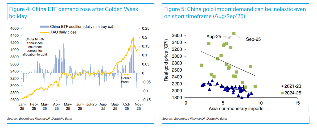 2.需求的非弹性特征:长期来看,中国对黄金的需求相对缺乏弹性。报告提供了两个有力的短期例证:在“黄金周”假期后,尽管金价较节前上涨了11%,但中国的黄金ETF需求依然走高,在10月16日达到每日流入0.14百万(即14万)金衡盎司的速度。在2025年9月,尽管金价上涨了9%,但中国的黄金进口量反而增加了6%。