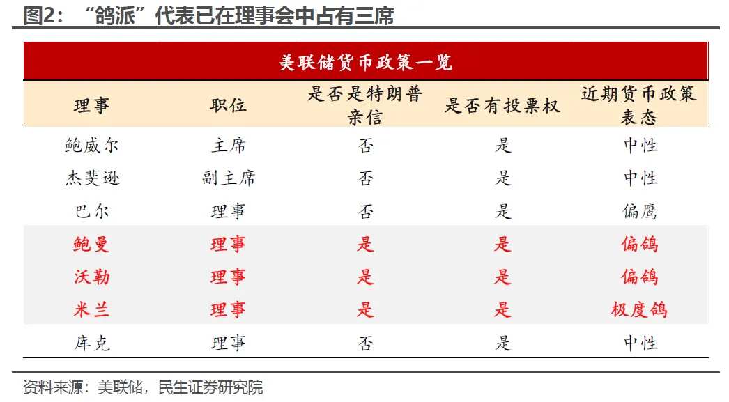 其中,包括鲍威尔在内的7名理事会成员是决策核心。目前特朗普已成功任命3名理事,分别是第一任期内任命的鲍曼、沃勒,以及填补库格勒离职空缺的米兰。这意味着特朗普仅需再获取1个提名席位,即可在美联储理事会占据多数,拿到4张稳定的鸽派选票——这也是其持续威逼库克和鲍威尔离职的核心原因。