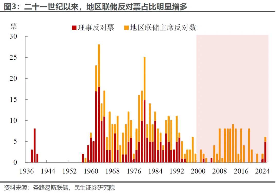 近年来,地区联储主席在FOMC中的话语权持续提升。我们梳理了1936年以来历次美联储议息会议的反对票构成,其中美联储理事共投出227张反对票,而席位相对较少的地区联储主席则投下278张反对票。并且从21世纪以来,反对票几乎全部由地区联储主席投出,在联储的利率决策中的影响愈发不可忽视。