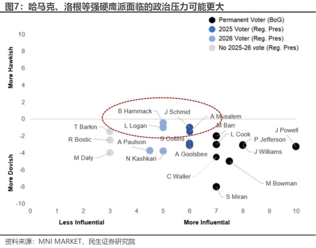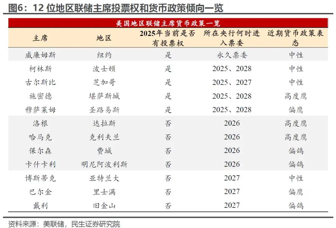 尤其是以洛根(达拉斯联储)、哈马克(克利夫兰联储)、施密德(堪萨斯城联储)等为代表的极端鹰派,几人近期甚至接连表态反对10月降息,施密德一度在10月议息会议上投下反对票。虽然施密德下次进入票委要到2028年,但洛根与哈马克所在的地方联储均为2026年的轮值票委,将参与明年降息决策,若两人寻求连任,大概率会遭到特朗普和理事会的强硬阻拦。