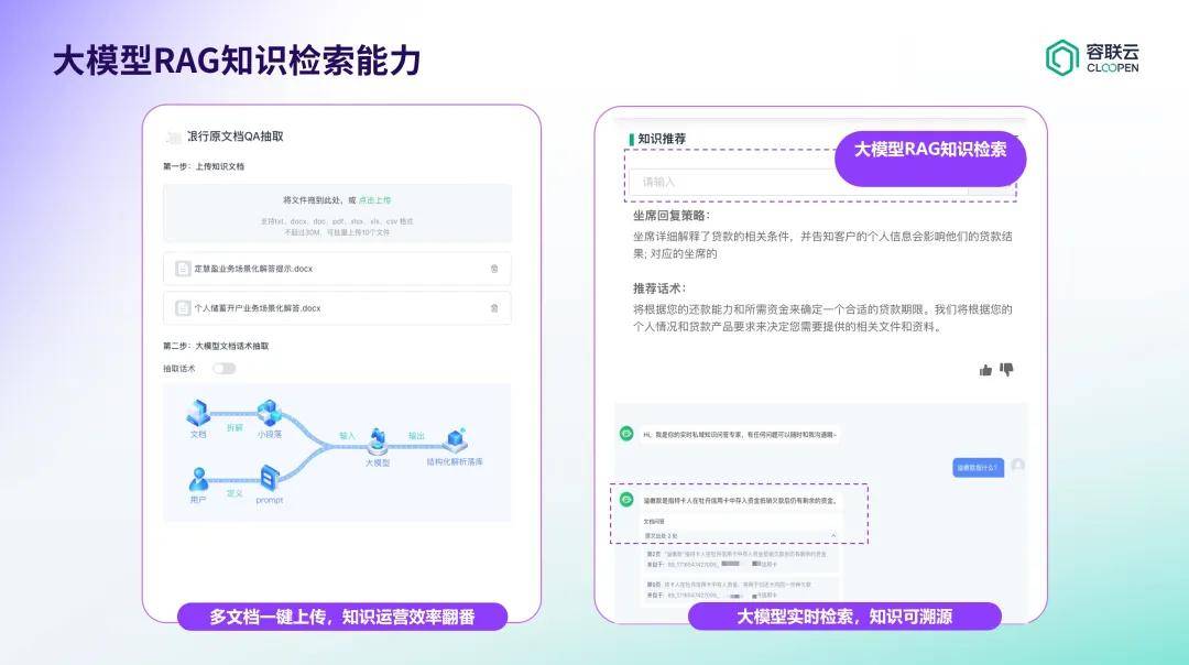 🔄 **技术闭环赋能持续优化**:容联云通过RAG技术实现私有数据的持续学习和话术库的动态优化,结合实时语音识别与意图理解,能够在通话过程中实现秒级推送金牌话术和流程导航,并能在3秒内响应风险预警。更重要的是,方案构建了“理解—推荐—反馈—学习”的闭环机制,将一线坐席的实战经验转化为可复用的结构化知识,有效解决了话术库冷启动和合规管控的难题,推动了人机协同运营的升级。