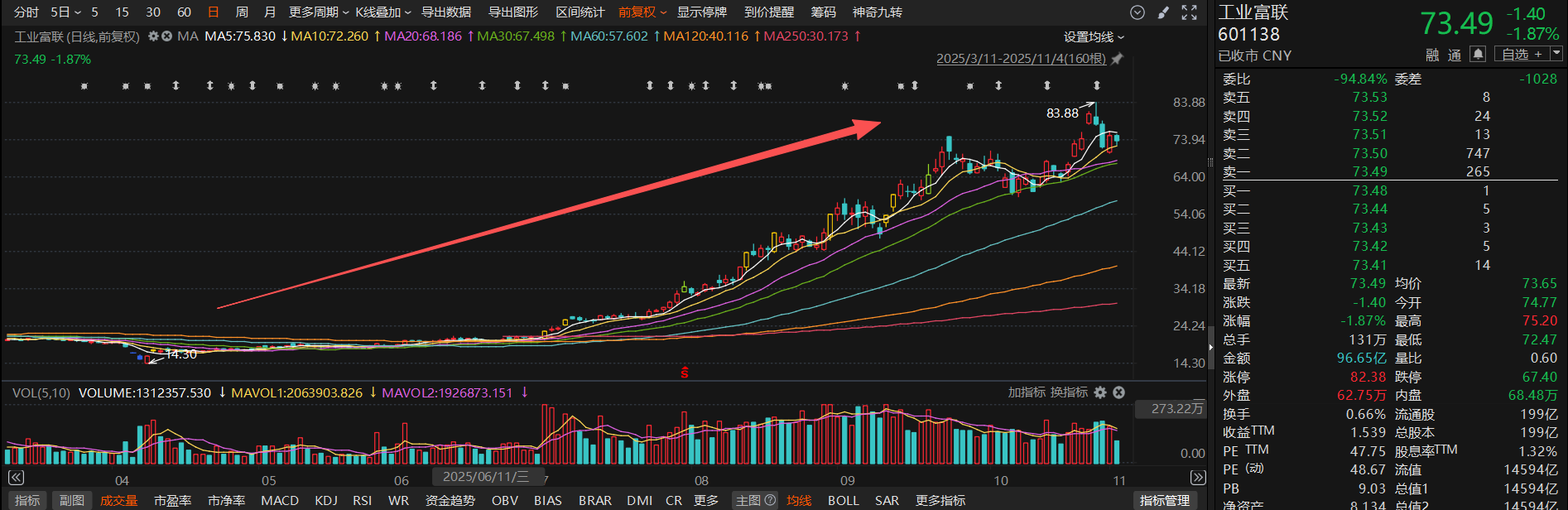 【工业富联:截至10月31日累计回购0.04%公司股份 已回购金额1.47亿元】财联社11月4日电,工业富联(601138.SH)公告称,截至2025年10月31日,公司通过上海证券交易所交易系统以集中竞价交易方式累计回购公司股份769.74万股,占公司目前总股本0.04%,回购最高价格人民币19.84元/股,回购最低价格人民币18.4元/股,使用资金总额人民币1.47亿元(不含交易佣金、过户费等交易费用)。小财注:工业富联4月14日公告,拟5亿元-10亿元回购股份用于注销,回购价格不超过20元/股。资料显示,因公司实施2024年年度权益分派,2025年7月31日起上述股份回购价格上限由不超过20元/股调整为不超过19.36元/股。二级市场上,工业富联自4月9日迄今股价累计最大涨幅为487%,并于6月25日后股价持续维持在20元/股上方。