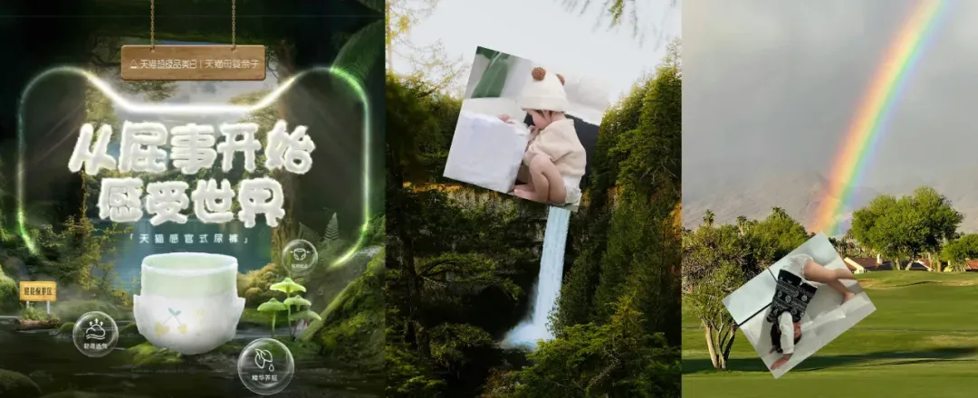 天猫的12大尿裤品牌,也玩起了“从屁事开始感受世界”的抽象游戏。一幅幅抽象的广告画作上,无不生动地表达宝宝穿上感官尿裤的体验,激发了用户一起参与到活动中来,不少UGC内容横空出世,彩虹屁、溪流屁等创意进一步深化了品牌的核心创新。