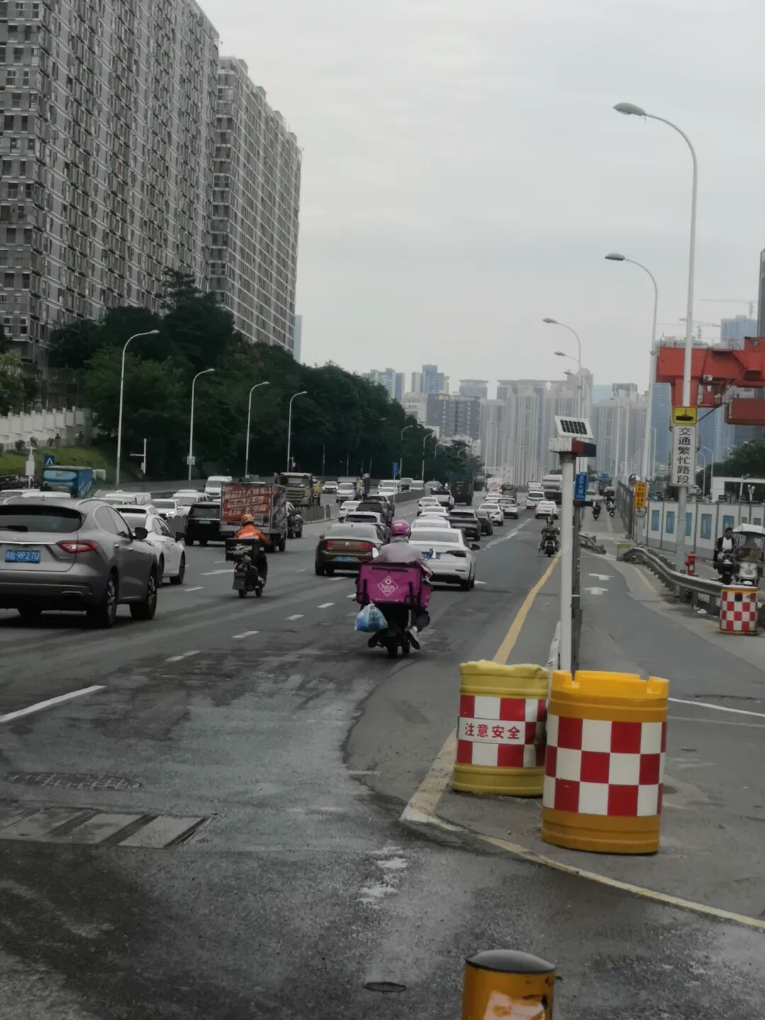 返程又是布龙路高架桥,这次我的行为更大胆了。刚上布龙路时还只在高架桥沿着路边骑行,到离民治大道约400米处,瞅准后方没有来车,我猛地斜插到最里面车道,贴着护栏往前骑行。一路超越了等红绿灯的几十辆车辆,到掉头位置才停下来,等来向车辆都过去了,我马上从布龙路逆行穿行到对面,一顿输出,成功省下了不少时间。想当初,我曾发誓红绿灯都不敢闯,如今竟能娴熟地在高架桥上逆行穿梭,连自己都觉得不可思议。