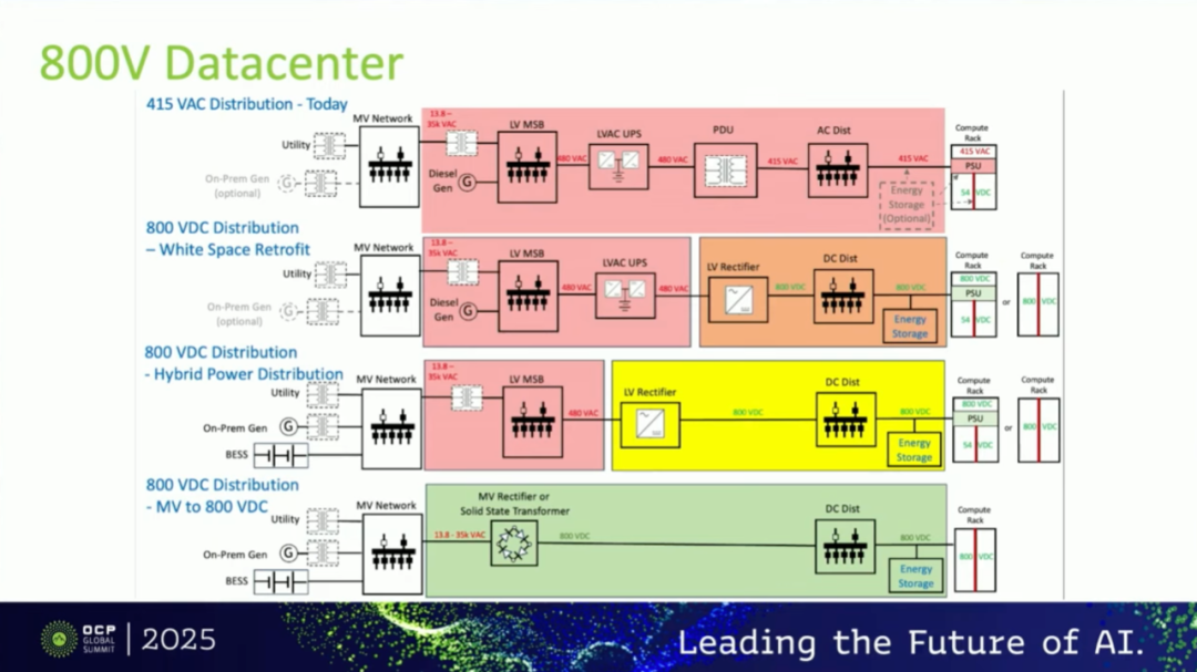 NVIDIA自己有一个数据,如果你还是用54伏做柜内的传输,你一个1兆瓦的机柜就需要200公斤的铜用来做传输电。功率是和电压的平方成正比的,也就是说你去增加电压可以大大地减少效率的损失。800伏直流和54伏直流,如果是一兆瓦的机柜,54伏可能需要在传输上损失22%的效率,这个损失太多了,如果拉到800伏的话,它的损失会降到0.6%,这是好几个数量级的进步。但现在数据中心还没有做到800伏的直流的能力,现在主要还是以415伏交流为例。