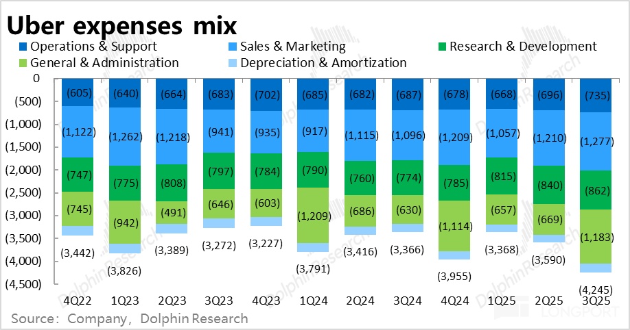在毛利率基本停止提升,同时费用支出增速大幅抬头的情况下,本季 Uber 的利润表现不算超预期的出色。调整后 EBITDA 本季约 22.6 亿,虽同比增长 33.5%,但仍小幅跑输预期。利润率(占订单额比重)为 4.54%,同比提升仅 41bps,利润率提升幅度是 22 年以来的最低值。