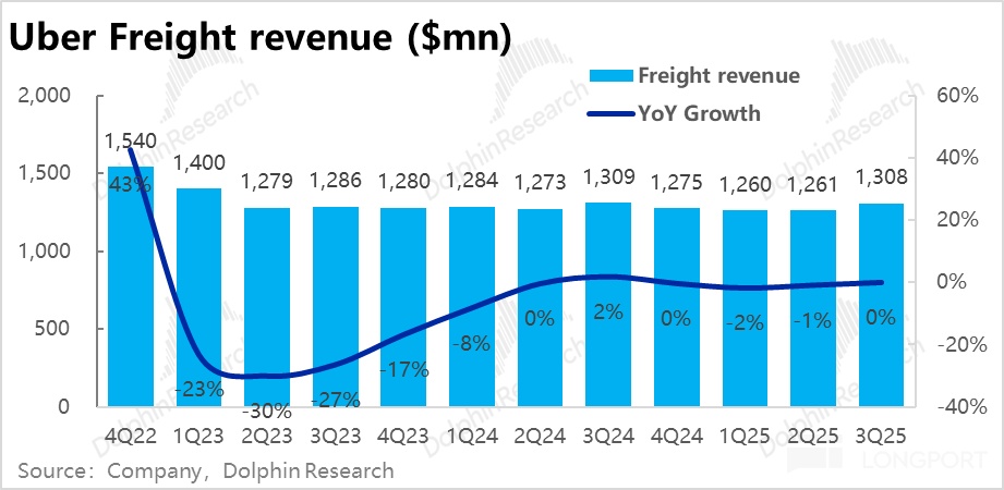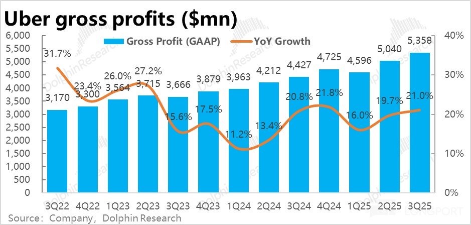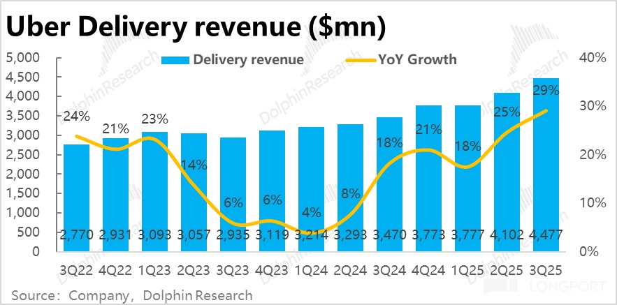 而外卖业务的变现率则继续走高,在不低基数下仍同比提升约 60bps。带动配送业务的收入增速环比明显提速了 4pct 到 29%,强于订单额增速。应当主要是Uber 在广告上变现的贡献。