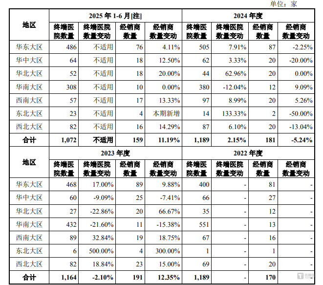 不过,海圣医疗的经销商结构存在明显波动。截至各期末,30万元以上规模经销商数量看似相对稳定(2022年末170家、2023年末191家、2024年末181家、2025年6月末159家),但整体经销商群体的流动性极大:2023年新增215家、退出191家,2024年新增277家、退出219家,每年均有大量经销商进出。
