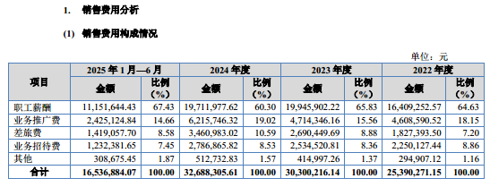 拆解销售费用明细,职工薪酬是核心构成。报告期内,职工薪酬的费用分别为1640.93万元、1994.59万元、1971.2万元、1115.16万元,分别占当期销售费用的64.63%、65.83%、60.3%、67.43%,占比始终超6成。