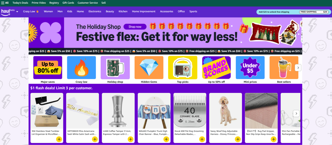 同一时段,亚马逊还“一反常态”地宣布了 2025 年不会提高美国站销售佣金和亚马逊物流(FBA)费用,也不会引入新的费用类型。进入 2025,Haul 以及同样主打低价的 Bazaar 已在全球多点布局,10 月刚在日本市场上线了测试版。