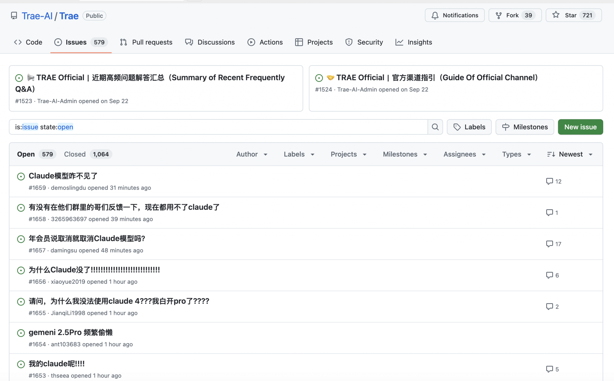 近期,大模型之家注意到,在GitHub社区上,关于Trae“背刺”的声讨此起彼伏:大量购买了Trae年费(Pro版)的用户发现,他们花真金白银买下的Pro权限,却突然发现Trae悄然下架了Claude大模型的使用权限,而这一举动,引发了开发者冲进了GitHub上的Issue区,纷纷表达自己的不满。