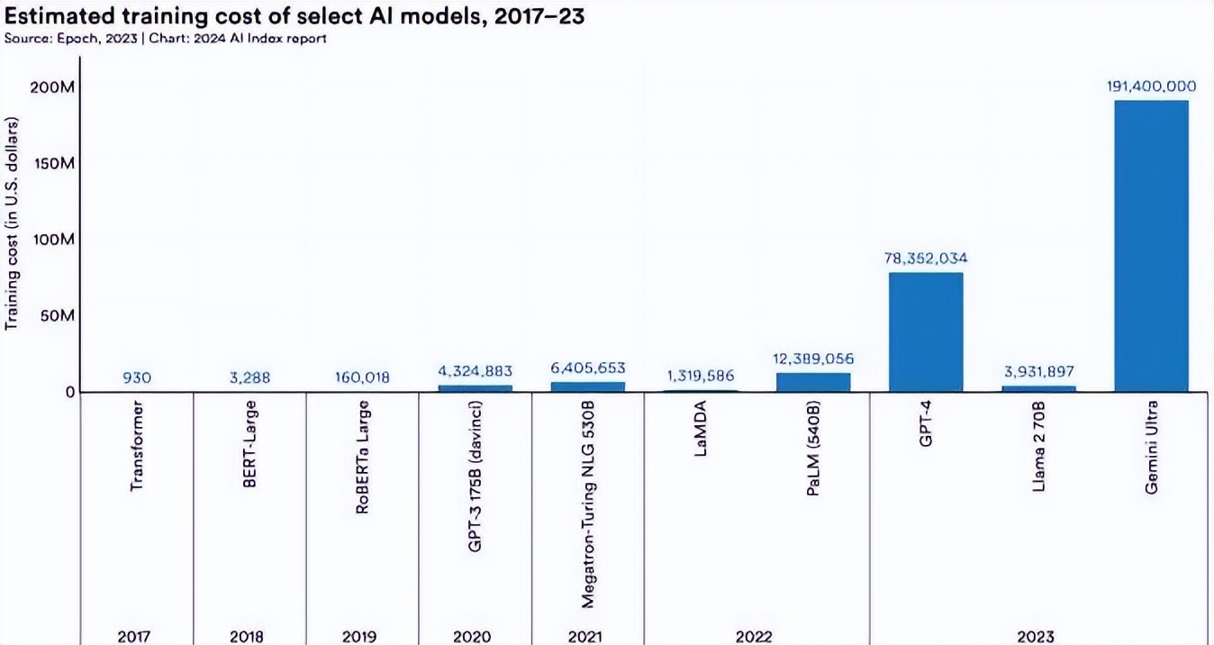 大模型训练成本的飙升速度令人瞠目。据《2024年人工智能指数报告》显示,2017年,Transformer模型训练成本约为900美元;到2023年,OpenAI的GPT-4和Google的Gemini Ultra的训练成本已分别达到了约7800万美元和近2亿美元。训练成本呈现飞速增长,这样的投入已非创业公司所能承担。