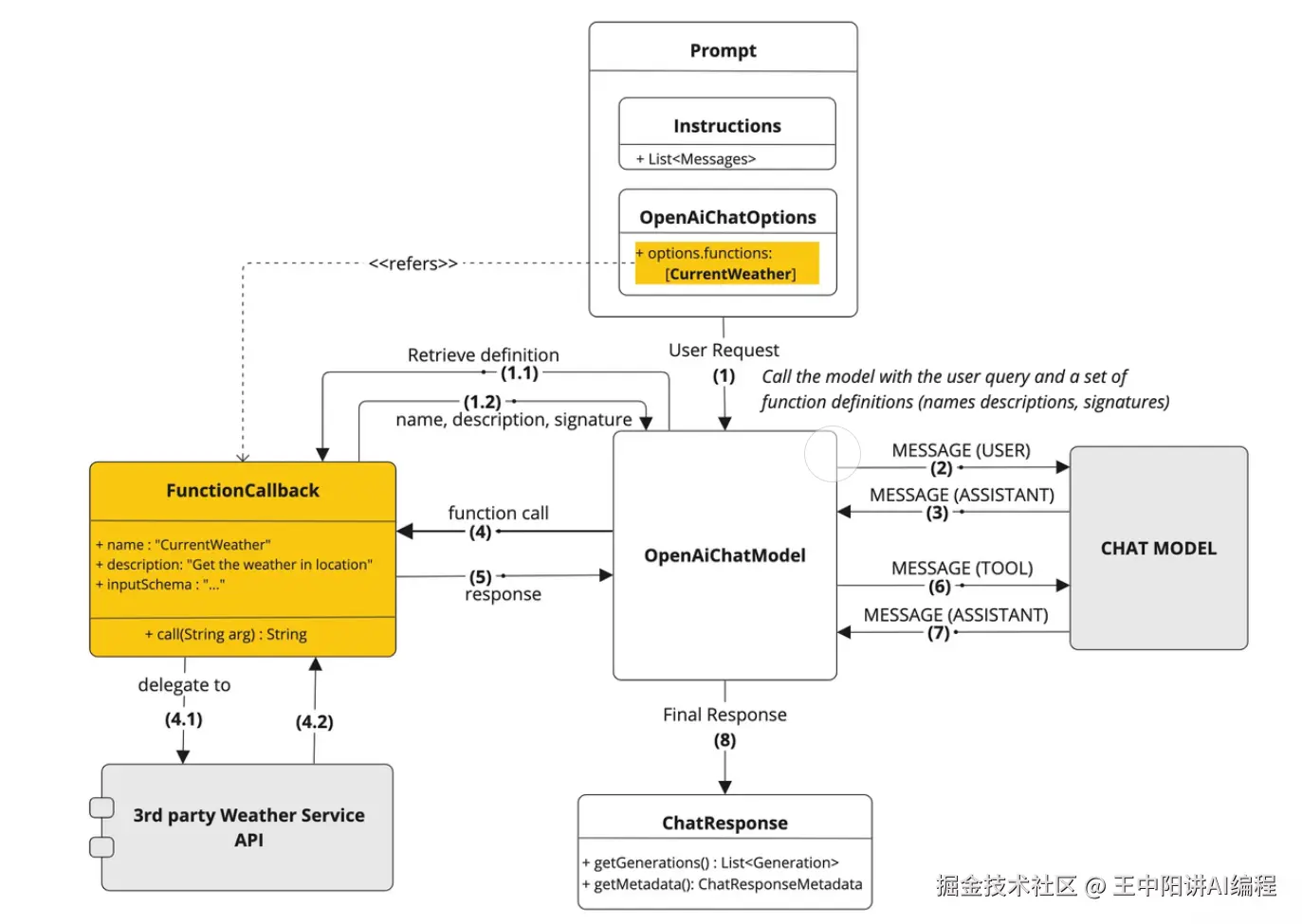 首先我们通过 Spring AI 官方 提供的图片来理解 Spring AI 在实现工具调用时都帮我们做了哪些事情?