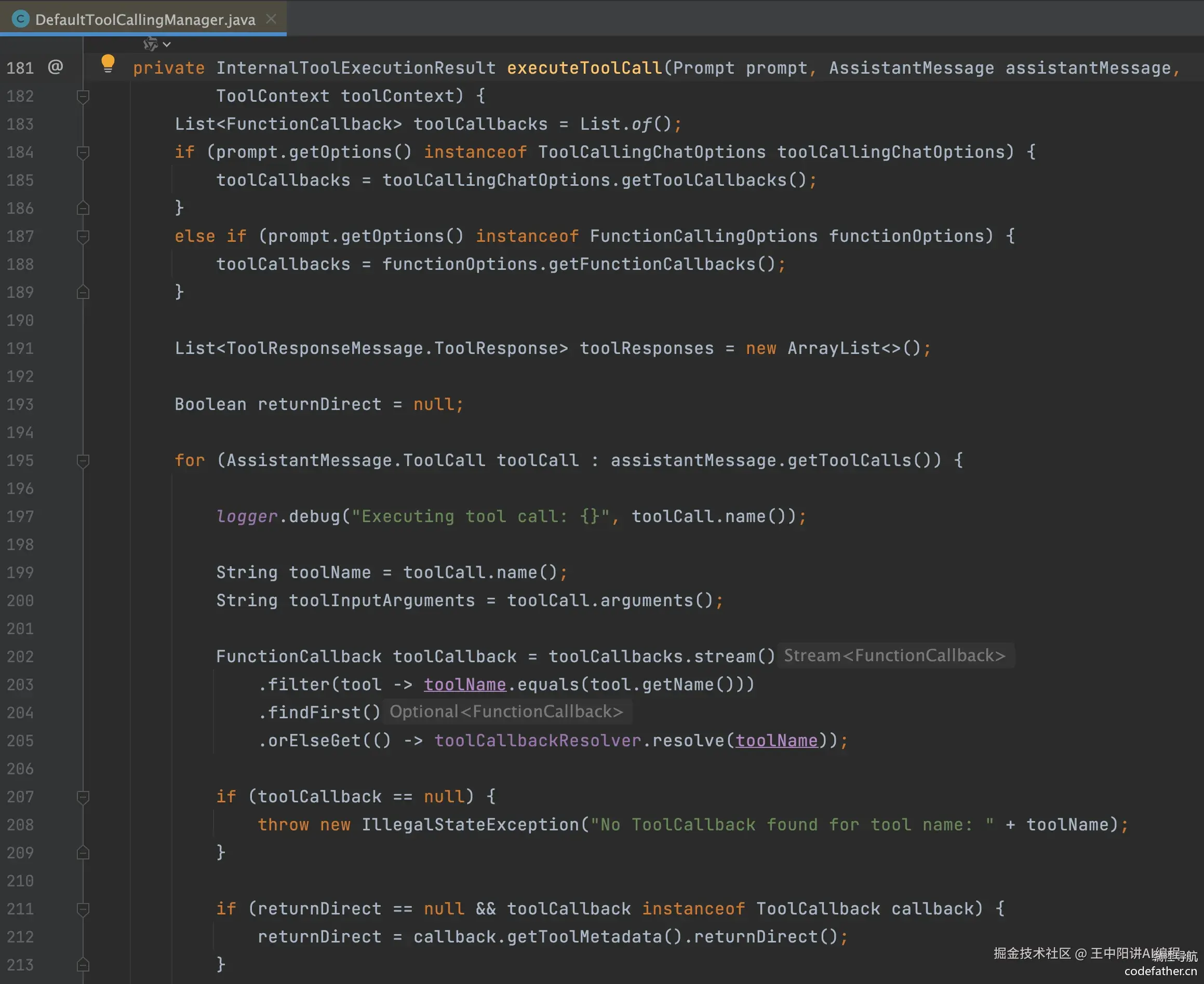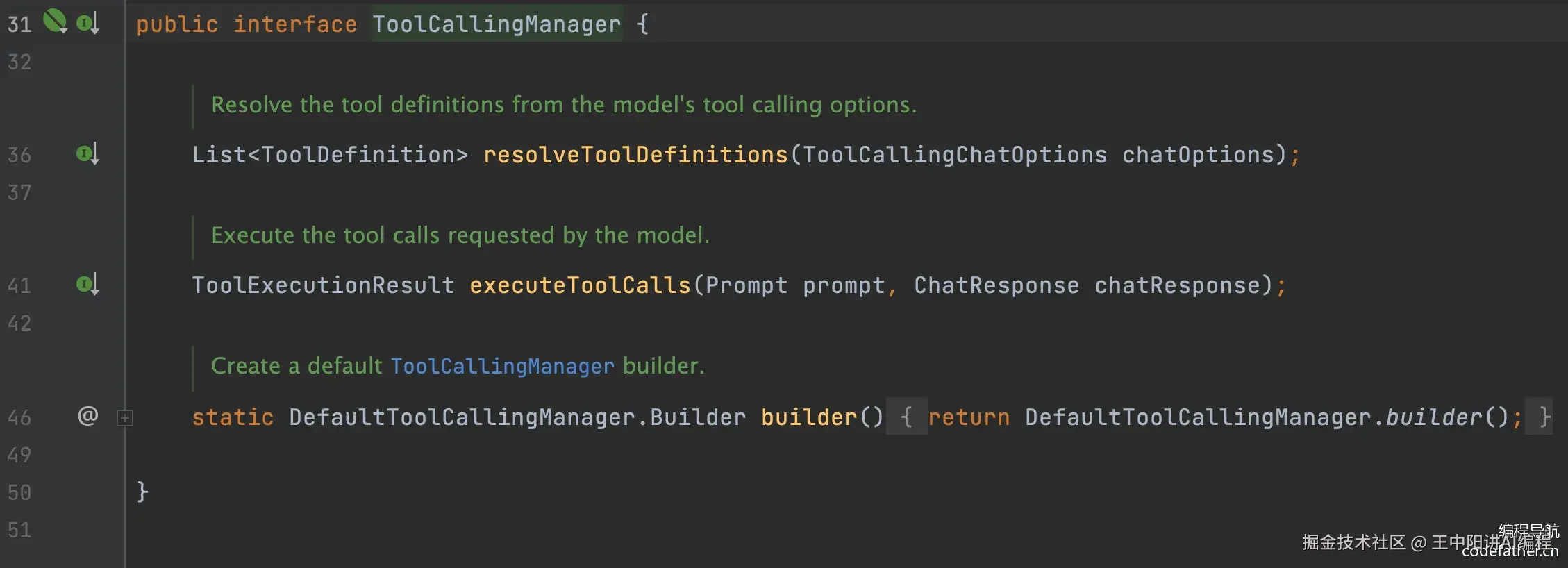 上图中,我们会发现 ToolCallingManager 起到了关键作用,由框架使用默认初始化的 DefaultToolCallingManager 来自动管理整个工具调用流程,适合大多数简单场景。