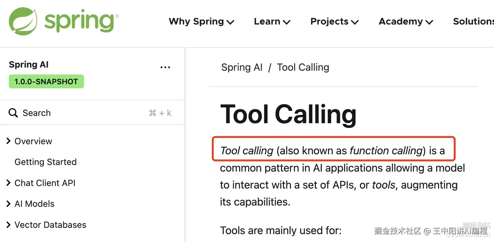 Spring AI 工具调用文档 的开头就说明了这一点: