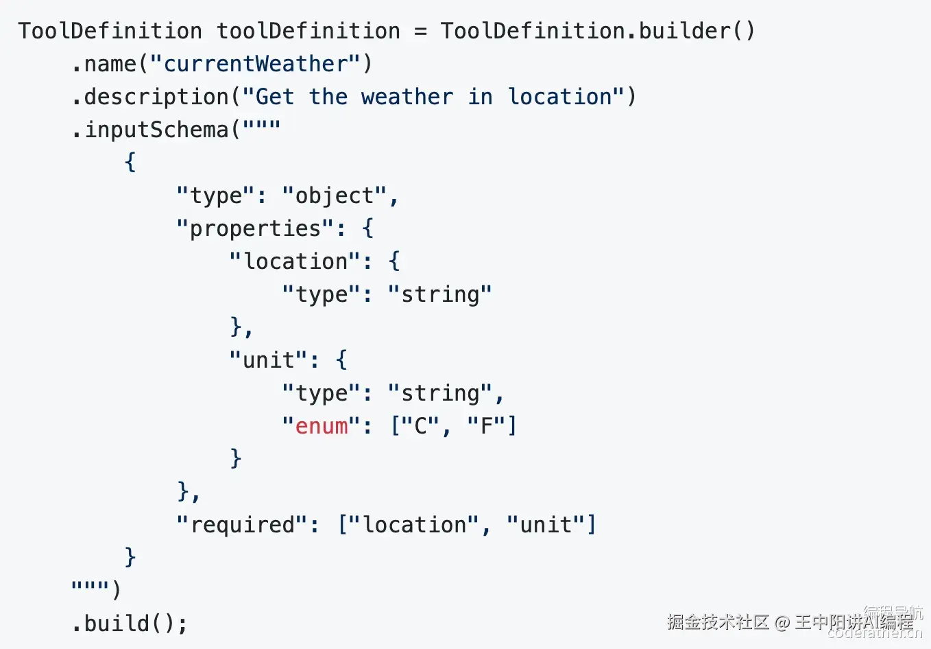 Method method = ReflectionUtils.findMethod(WeatherTools.class, "getWeather", String.class);ToolCallback toolCallback = MethodToolCallback.builder() .toolDefinition(ToolDefinition.builder(method) .description("获取指定城市的当前天气情况") .build()) .toolMethod(method) .toolObject(new WeatherTools()) .build();其实你会发现,编程式就是把注解式的那些参数,改成通过调用方法来设置了而已。AKPc6M4iKSkEWXIgF/