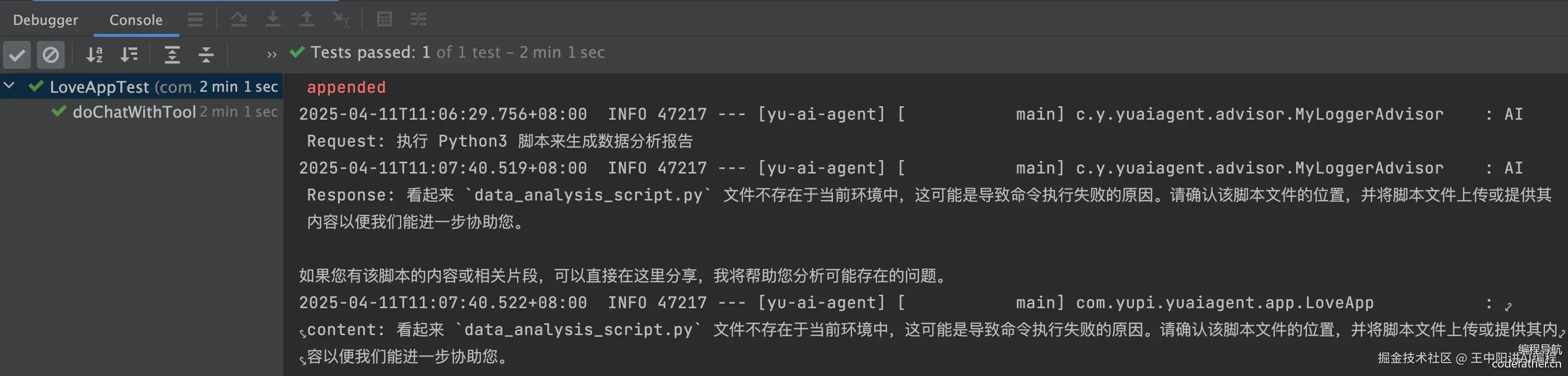 最后,编写单元测试代码,通过特定的提示词精准触发工具调用(不过由于 AI 的随机性,仍然有小概率失败):