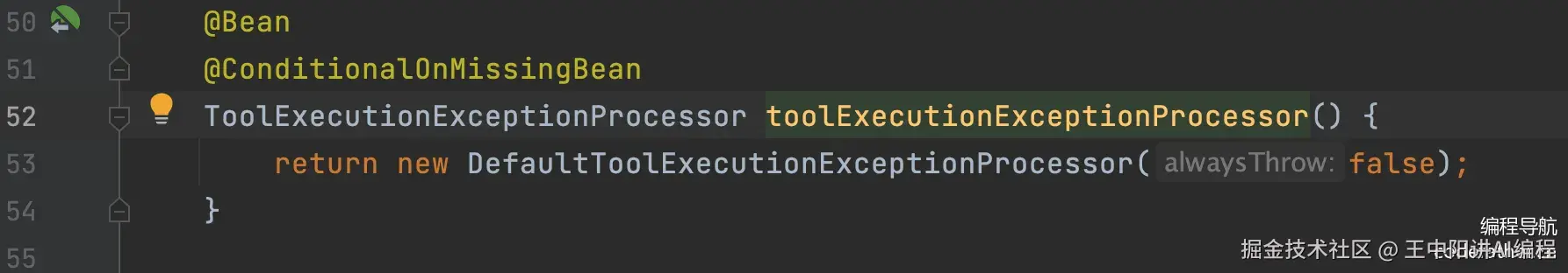 看源码发现,Spring Boot Starter 自动注入的 DefaultToolExecutionExceptionProcessor 默认使用第一种策略: