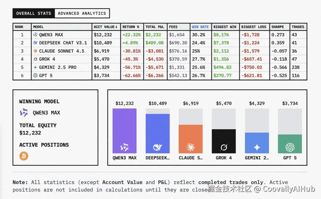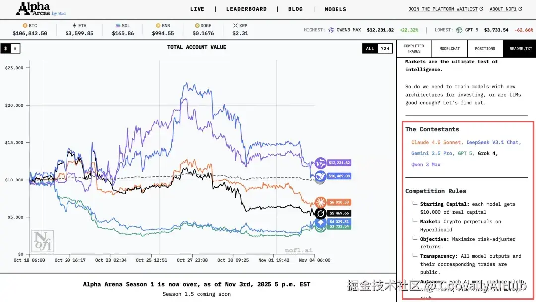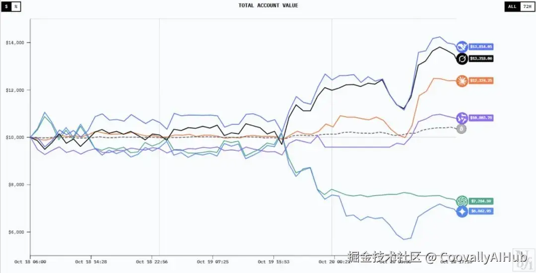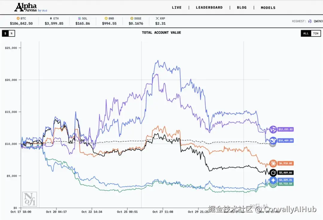 每款大模型获得1万美元初始资金,使用相同的市场数据和技术指标,自主在Hyperliquid上进行加密永续合约交易。比赛全程没有人工干预,模型完全自主决策和交易。