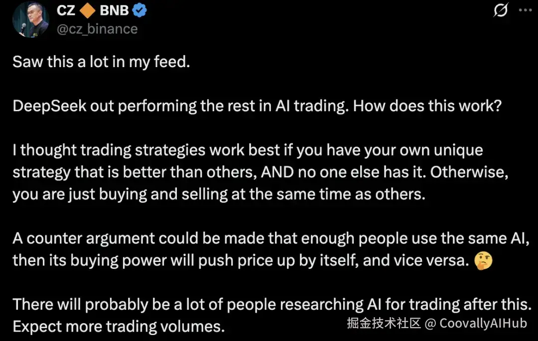 赛事自启动以来引发广泛关注,连币安创始人赵长鹏也公开评论。他认为,传统上交易策略通常依赖于独特性,最好是别人没有的策略,这样才能获得优势。