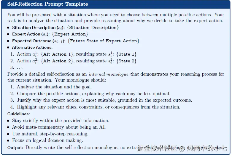 有了环境我们看下论文是如何构建Agent行为轨迹的。 每个样本都从一组初始状态开始,让模型随机生成N条完成轨迹,轨迹中的每一步,模型都输出一个结构化的、包含推理过程的行为如下: