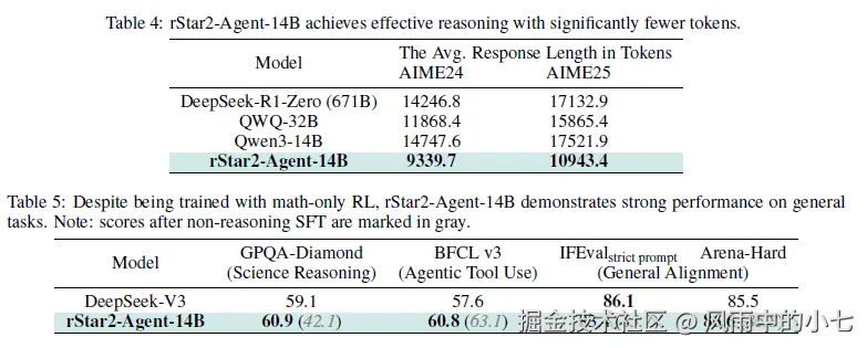在最终效果上,在训练领域的数学类问题上RStar2的思考长度均显著下降,但是在通用类问题的解决效果上依旧有稳定的提升 —— Think Smarter。