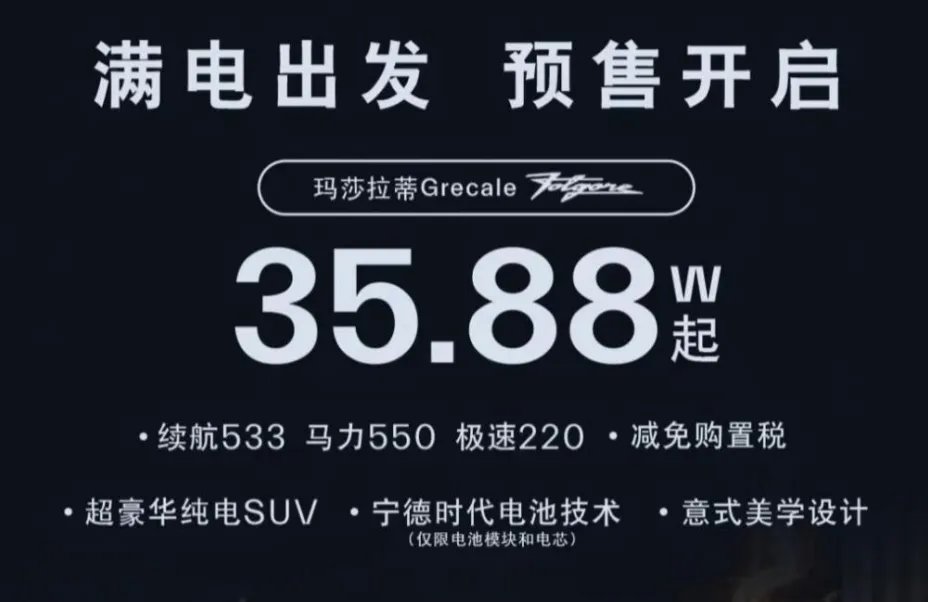 公开资料显示,Grecale Folgore是玛莎拉蒂于2024年12月推出的首款纯电动SUV,官方指导价为89.88万元。该车基于400伏电气平台打造,配备105千瓦时电池组,CLTC工况下纯电续航里程达533公里。按照35.88万元起的报价,相当于打了不到4折。