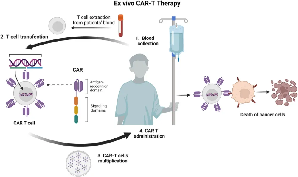 图1 体外CAR-T细胞疗法示意图。通过白细胞分离术从患者或健康供体体内分离出T细胞,再利用针对特定癌症抗原设计的嵌合抗原受体(CAR)构建体,对这些T细胞进行基因修饰。随后,对这些修饰后的T细胞进行培养和扩增,再回输至患者体内。激活后的CAR-T细胞能够识别并杀伤表达靶向抗原的癌细胞,且有望为患者提供针对癌症复发的长期免疫保护。图源:参考文献[15]