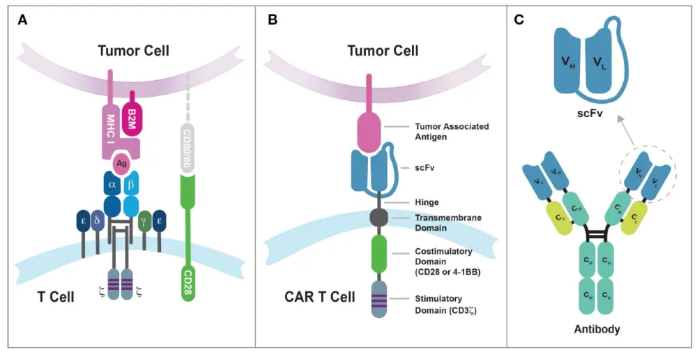 图2 传统T细胞受体(TCR)与人工合成嵌合抗原受体(CAR)在肿瘤抗原识别中的差异。图源:参考文献[1]