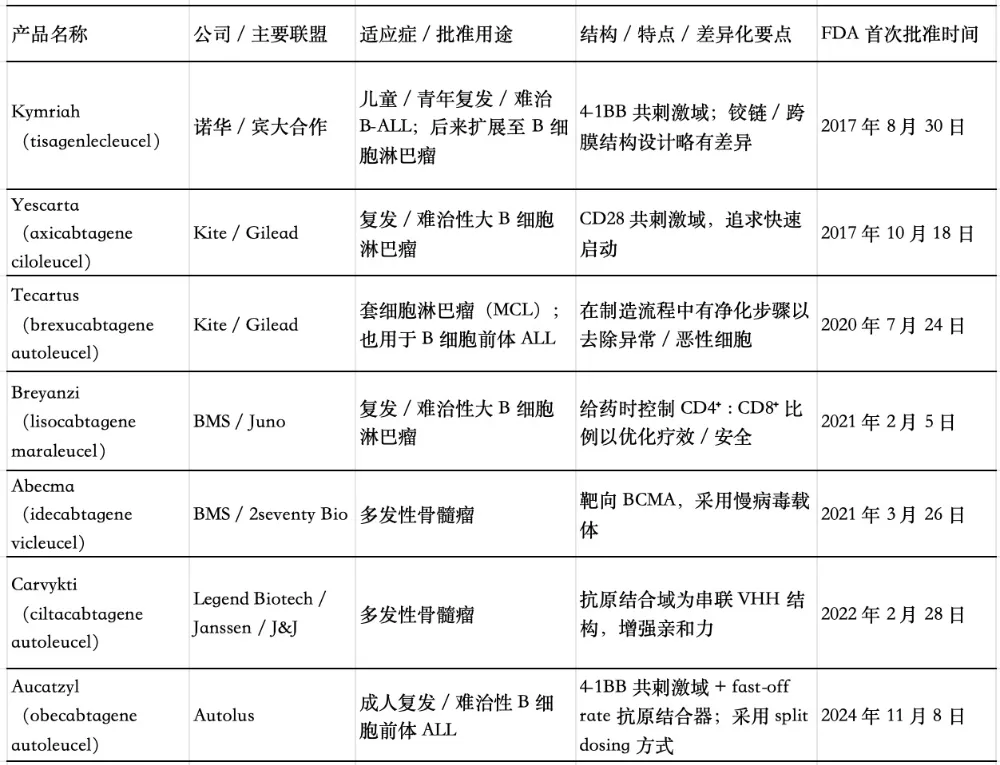 表2 截至2024年FDA已批准CAR-T产品。作者整理