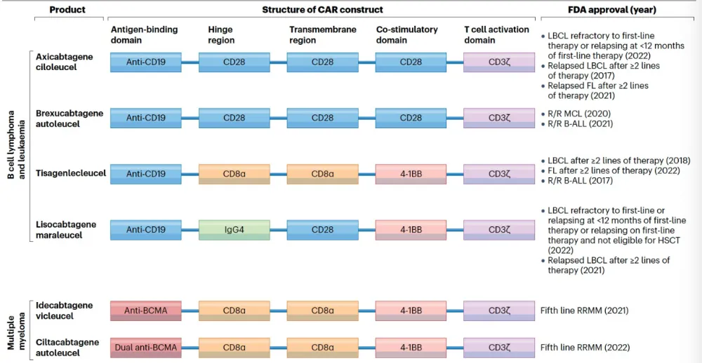 图3 截至2023年FDA批准的六款CAR-T产品及其结构设计特点。这六款也是目前欧盟获批产品。图源:参考文献[2]