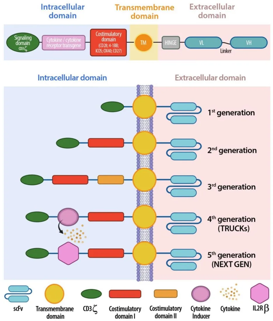 图4上图:CAR-T细胞结构迭代示意图:包含胞内结构域、跨膜结构域和胞外结构域。下图:五代CAR的演变过程:从仅含一个激活结构域的第一代CAR,到旨在提升安全性和有效性的最新一代(下一代)CAR。图源:参考文献[16]